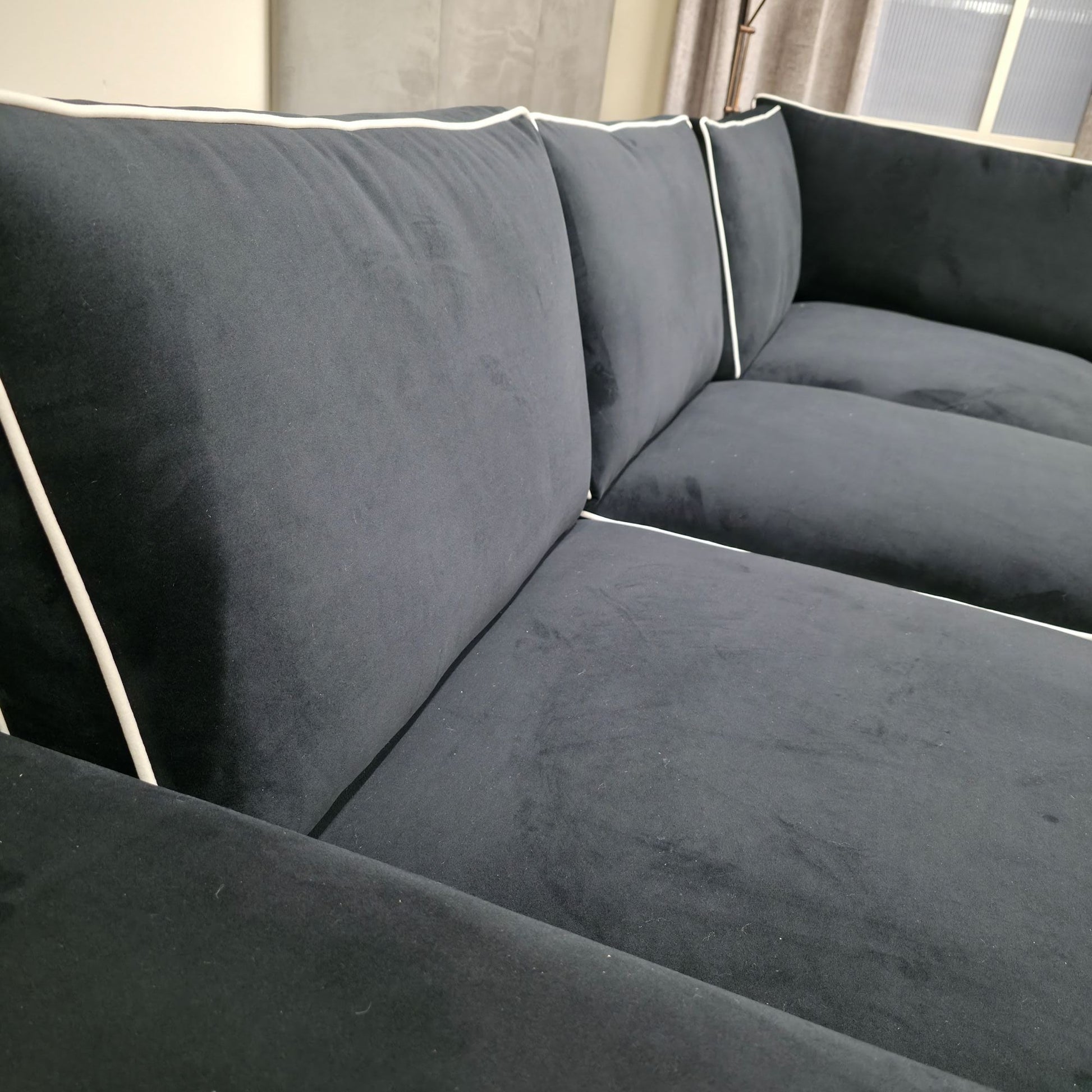 Perfect for entertaining, this sofa provides ample space with oversized seating, featuring a generous 110cm depth from front to back, making it ideal for family relaxation. The striking white lining finish adds a touch of brightness to its already stunning design.